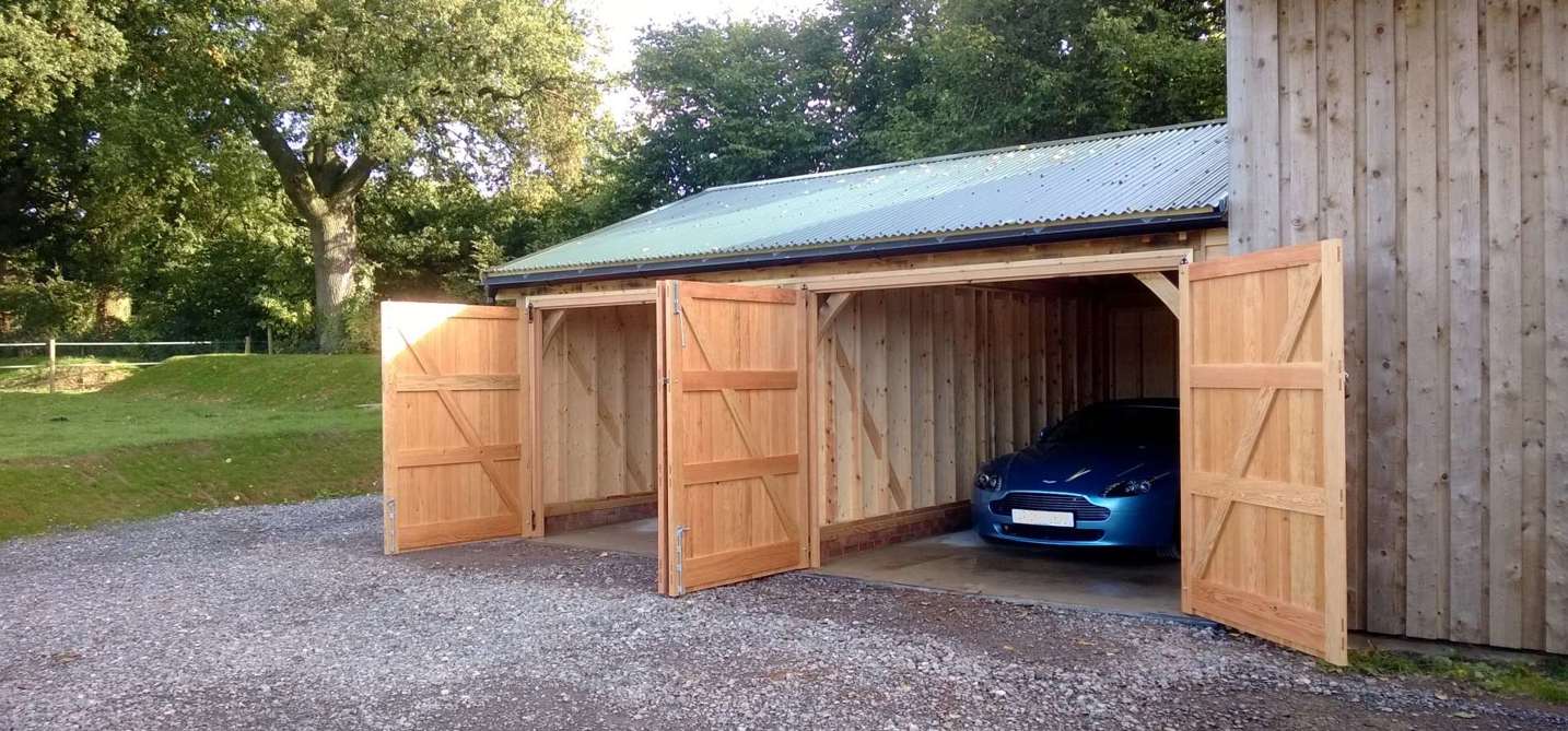 A 3-bay garage with loft floor above. One bay features double oak doors with traditional ironmongery, the other remains as an open fronted car port and the third creates the storage room.