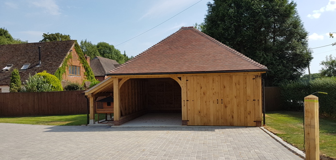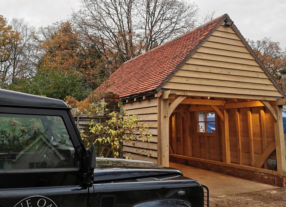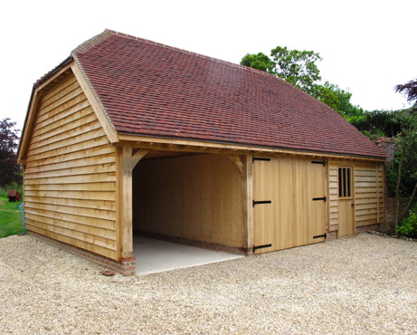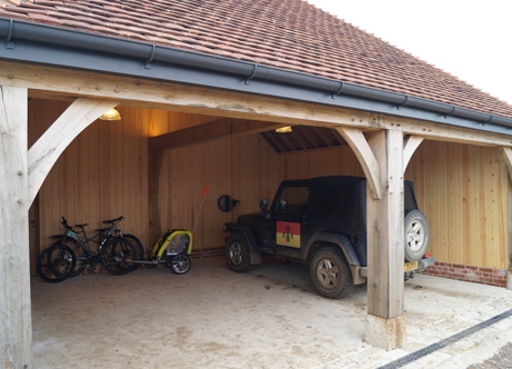 This single garage is oak through and through; oak frame, oak cladding, oak sarking boards, oak studs and rafters. The finished building sits on a low brick wall with a concrete floor, a clay tiled roof, small side window, interior and exterior lighting and power outlets inside.