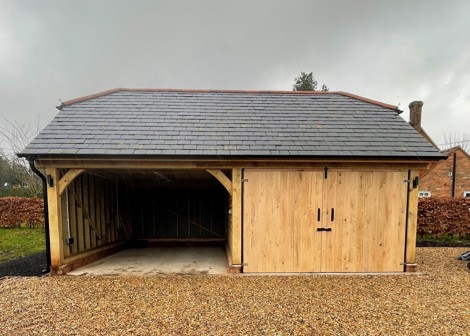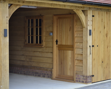 A two bay oak framed garage with one open and one enclosed bay designed as an office space, with a handy log store to the side.
