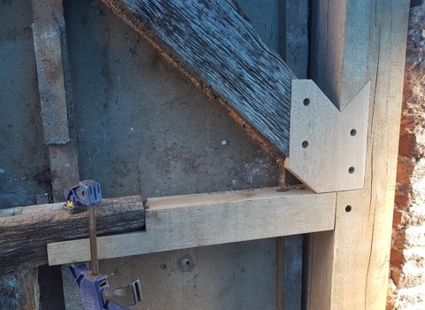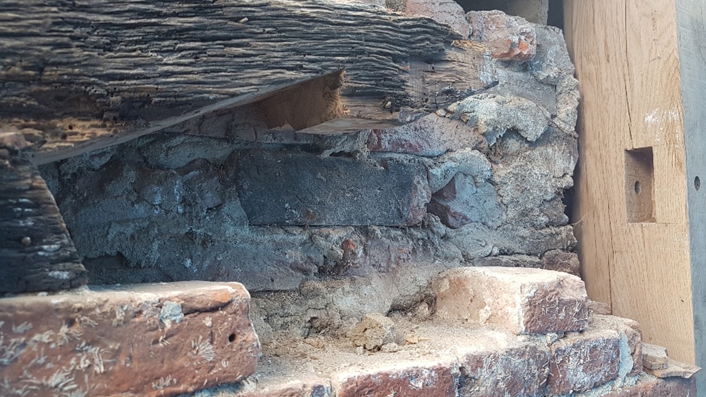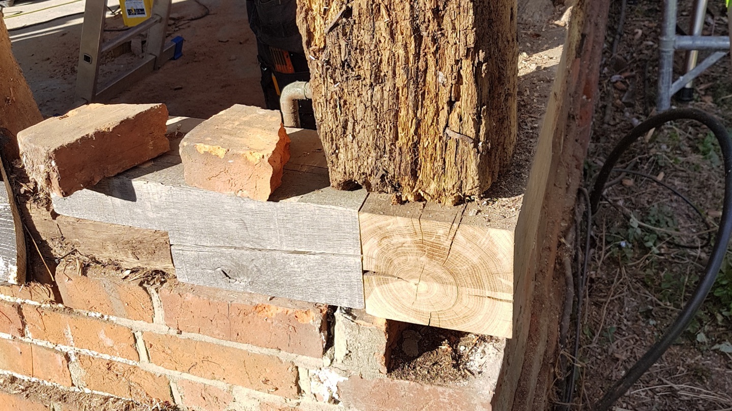 Part of our job as restorers is to retain as much of the original materials as possible, whilst still ensuring we make a good repair. Here we've removed the crumbling bricks and cut back the original oak post until we find solid wood. We then hand cut a new piece of timber to fit and brace the two together. The finished job shows the repaired wood and replaced brickwork, all carefully chosen to match the existing finish as is possible.