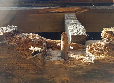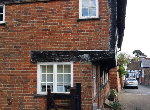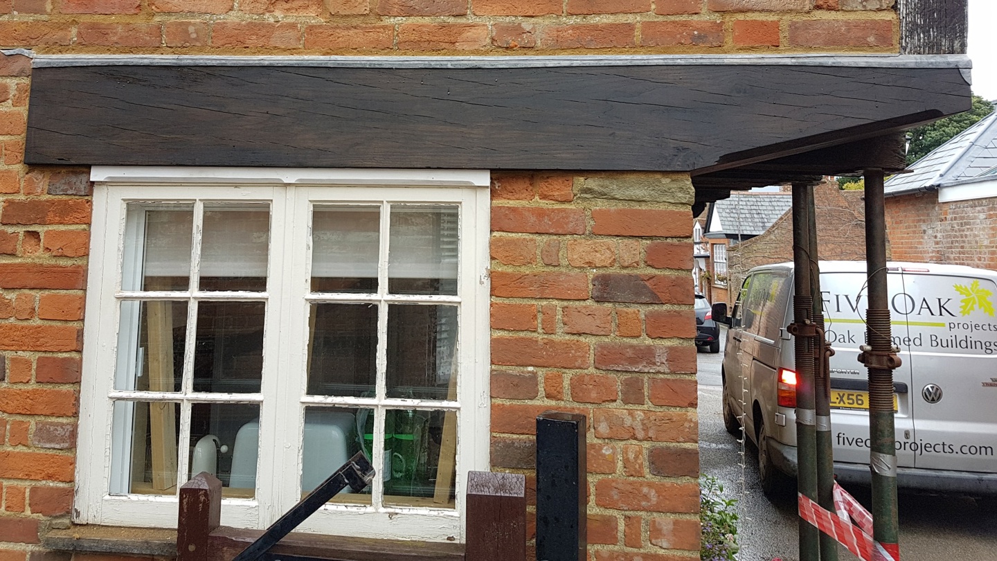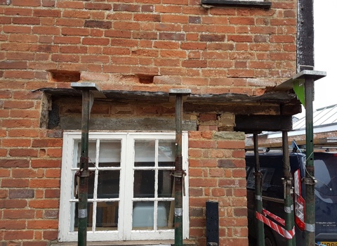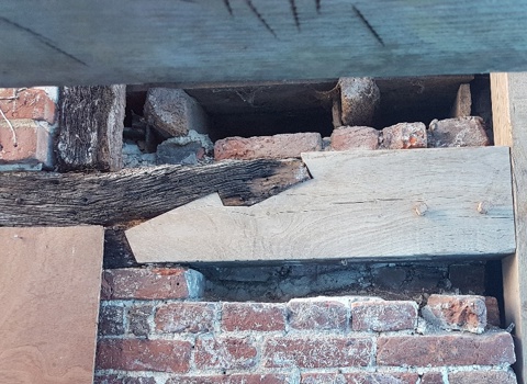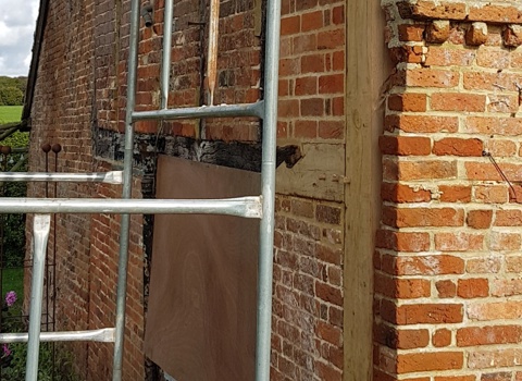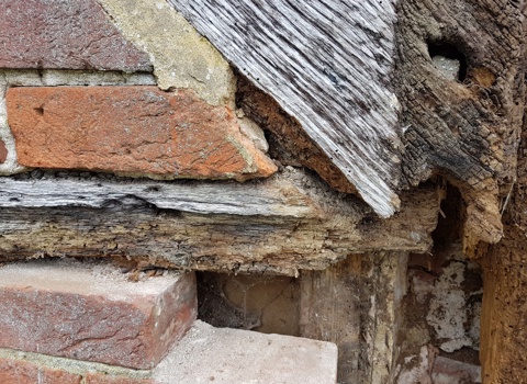 This rotting beam, holding up the corner of this listed cottage, was badly in need of replacement. A new beam was fitted and the job was finished with matching bricks to the conservation officers' and our clients' satisfaction.