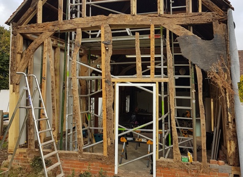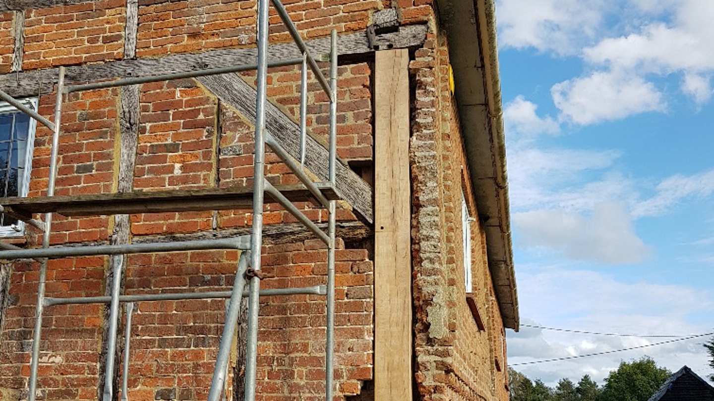 The gable end of this Grade II timber framed house was in a desperate state of disrepair when our clients bought it. Commissioned to make essential repairs, with the appropriate permissions in place, we set about replacing the decayed wood with new solid oak timbers.