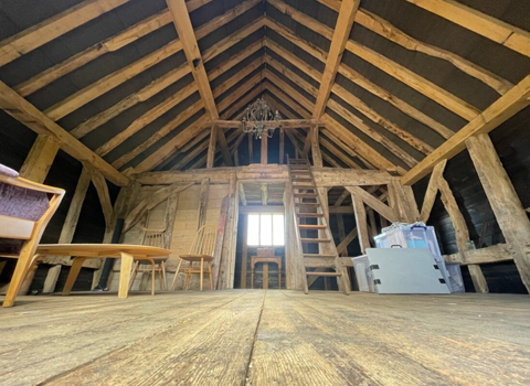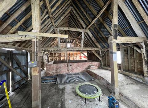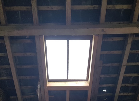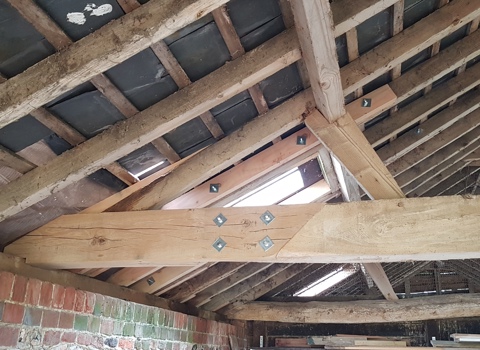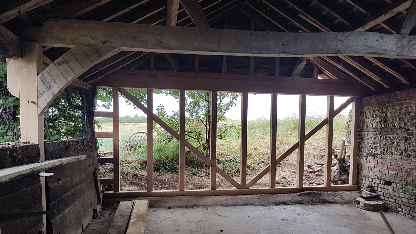 We've made essential repairs to the key structural elements of this elm framed barn to include the tie beams, roof window frame and the gable end wall. You can clearly see where sections of rotten wood were removed or reinforced with new timbers.