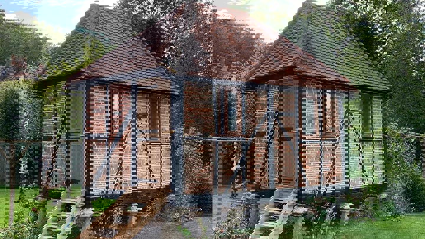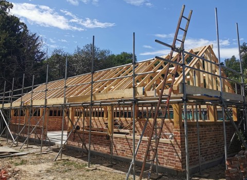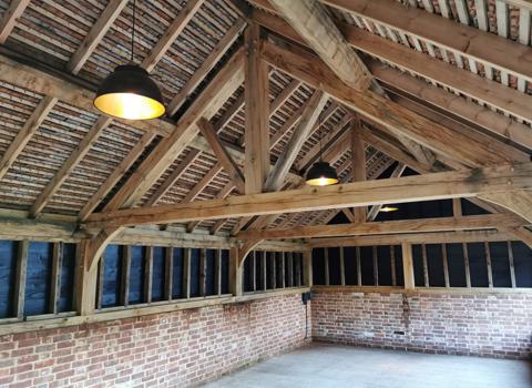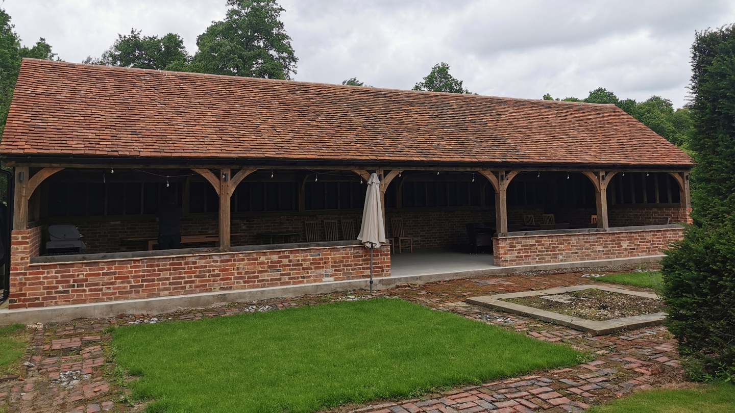 With a listed cart shed to re-build following its complete collapse, we started by salvaging from site as much and as many of the original materials as we could find to include bricks, timbers and roof tiles. Using traditional methods and materials we then set about re-creating an exact match to the original 5-bay building. Each individual reclaimed roof tile is fixed in position with individually custom drilled, hand crafted oak pegs. A true labour of love...
