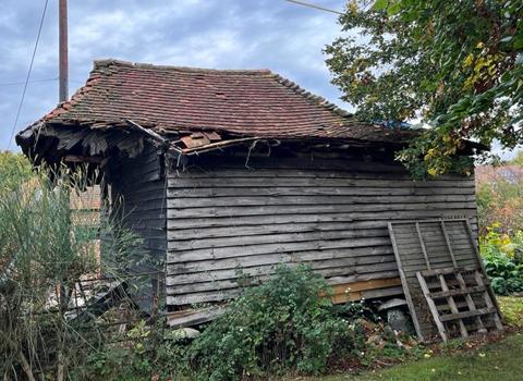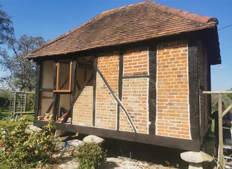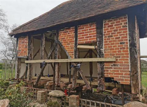 Another listed granary that was in much need of restoration! We have to strip the building back to its basic frame to fully appreciate what work is needed and assess what can be kept and what timbers need to be strengthened by splicing with new hand crafted oak. Once the integrity of the building is restored, we re-dress it with oak cladding, reclaimed roof tiles and, in this case, hand crafted oak mullioned windows, steps and doors - both front and back. Lastly, we restore the dwarf brick wall with original bricks and traditional lime mortar to finish.