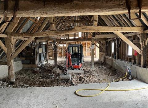 Before, during and after images of this large barn restoration and rejuvenation project. The original grain store and differing floor levels were dug out so a new floating concrete floor could be installed. All the outer support posts had been previously encased in concrete and so had rotted away to nothing at the base (which is what happens if moisture cannot escape), so new timbers scarfed in to re-stabilise the whole structure. Internal posts were supported on new brick plinths with lime mortar (built using original bricks) and all damaged or missing roof timbers repaired or replaced. Lastly, 3 sets of new bespoke oak barn doors installed and this beautiful building was ready for it's inaugural party.
