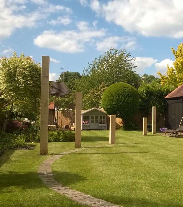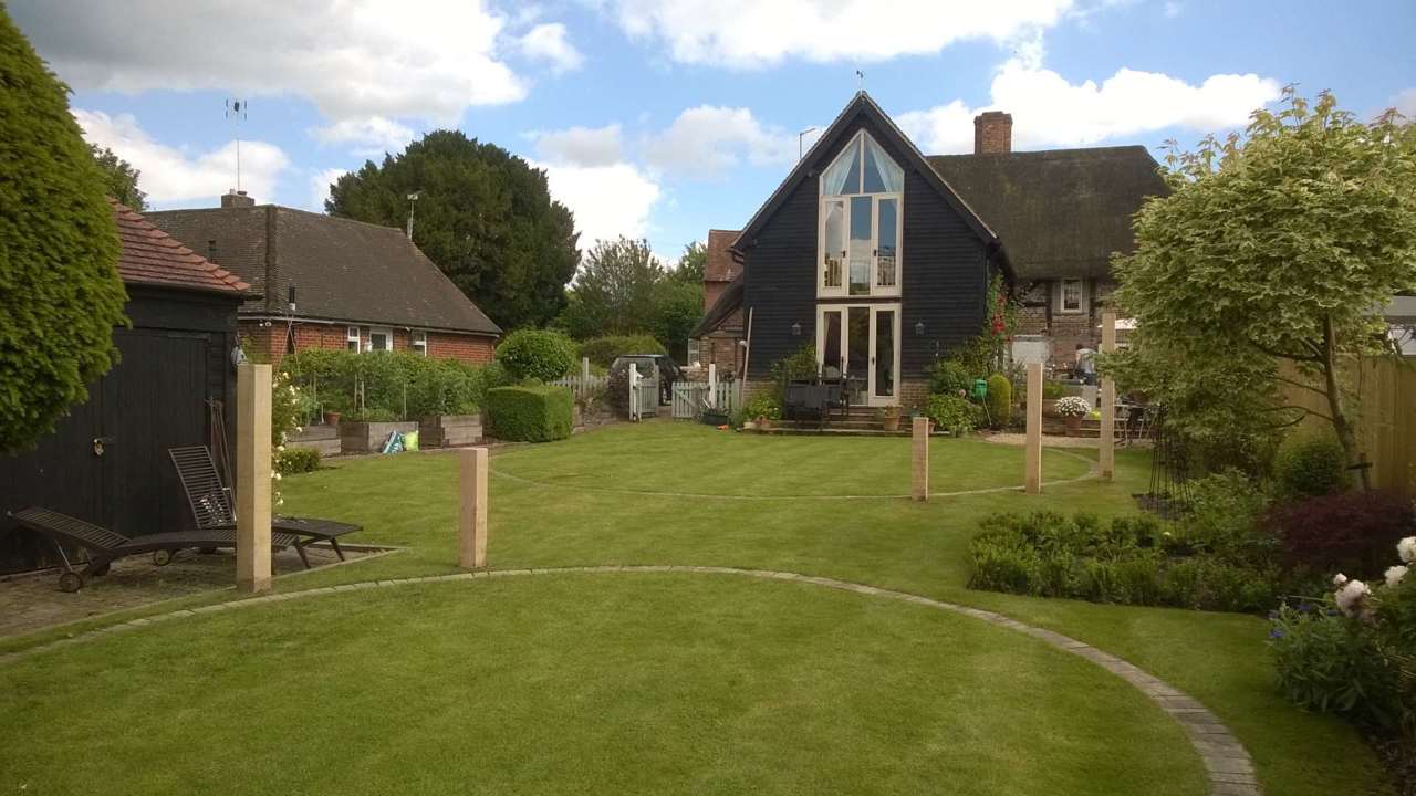 Upright oak posts and 2 large circles of oak paviours, laid flush with the lawn, add style and structure to this Hampshire garden.