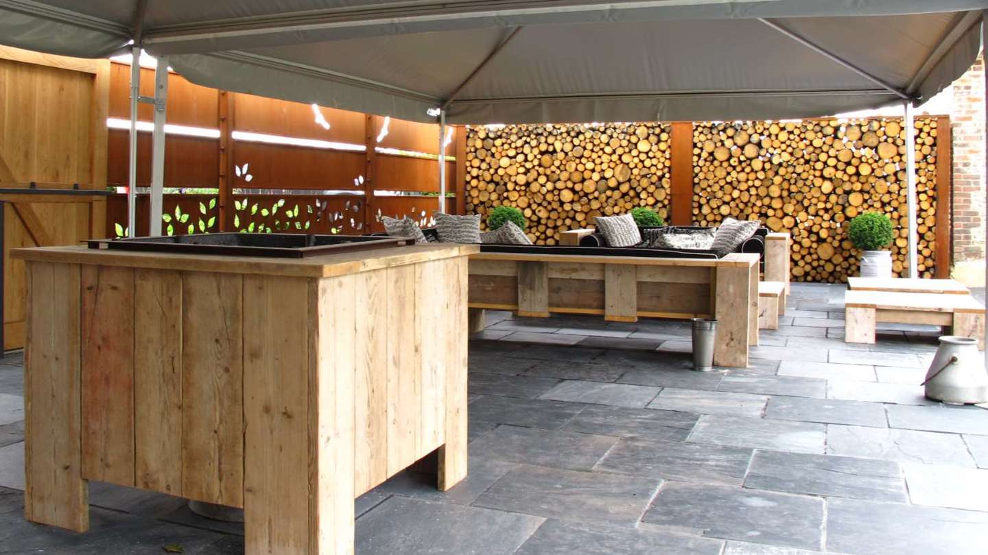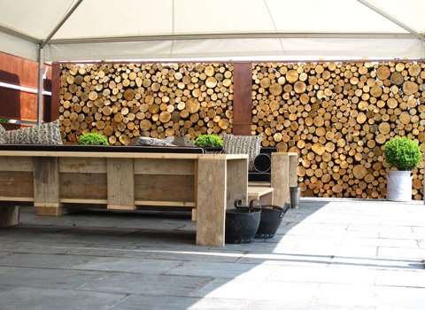 A feature log wall provides the perfect backdrop to the all weather bar and entertainment area set up in this canopied barn extension for this West Sussex wedding venue. A simple wooden bar and chunky wooden furniture complete the simple presentation at southendbarns.co.uk.