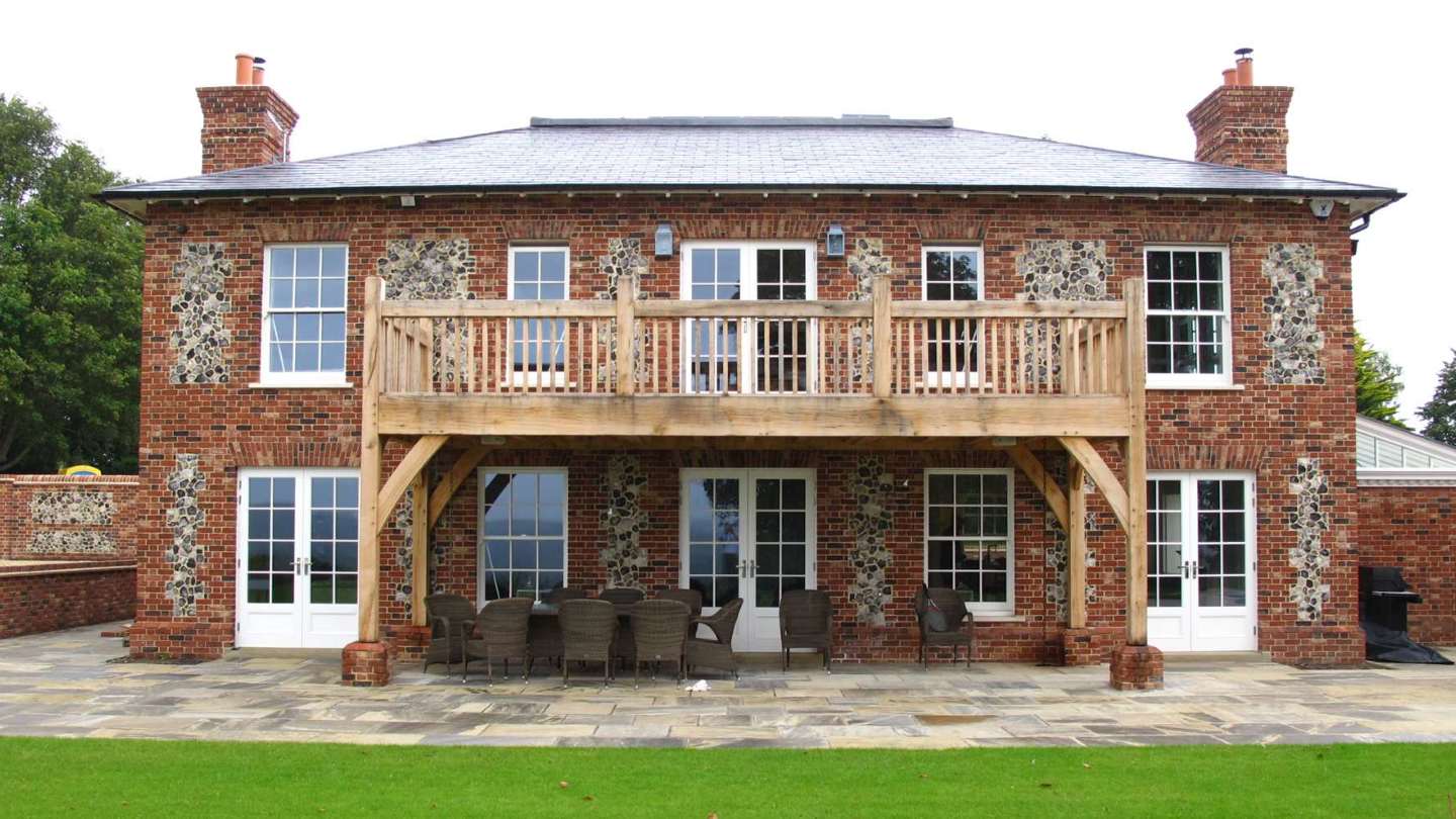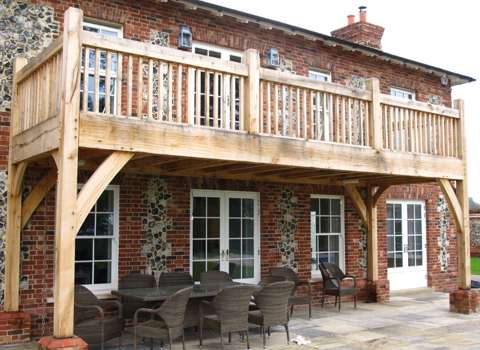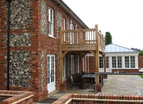 We designed and provided the oak for this stunning triple-width balcony with covered area beneath, built onto the rear of this West Sussex flint stone house.