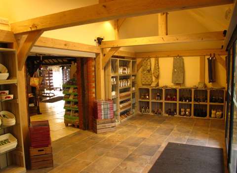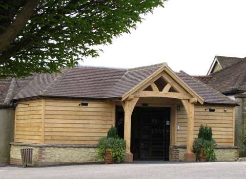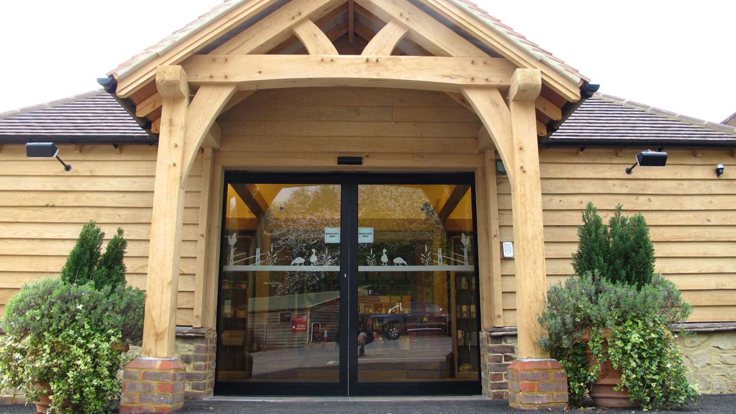 An old plastic 'lean to' wasn't creating quite the right impression as the entrance to this Surrey farm shop, whereas this replacement solid oak frame addition does, as well as providing additional display and weatherproof (!) space.