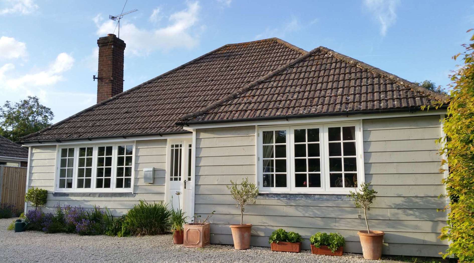 Replacing old UPVC windows and doors and covering this bungalow with shiplap cladding, painted one of 50 shades of grey, has transformed a formerly dull and uninteresting house into a contemporary and welcoming home.
