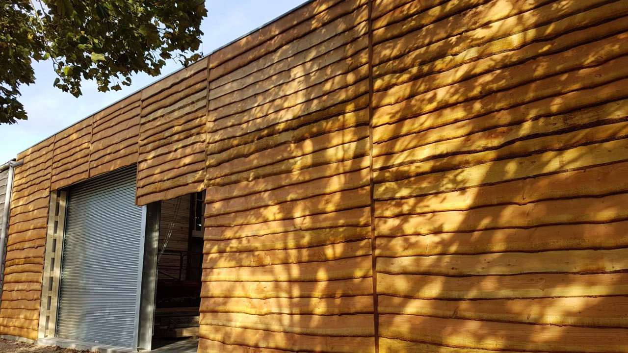 Cladding this large working barn with waney-edged Douglas fir timbers in glorious Autumn sunshine for englishwoodlandstimber.co.uk.