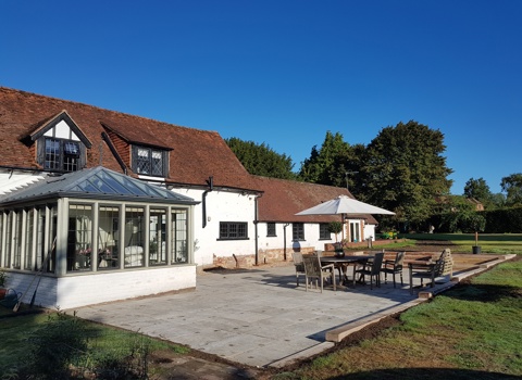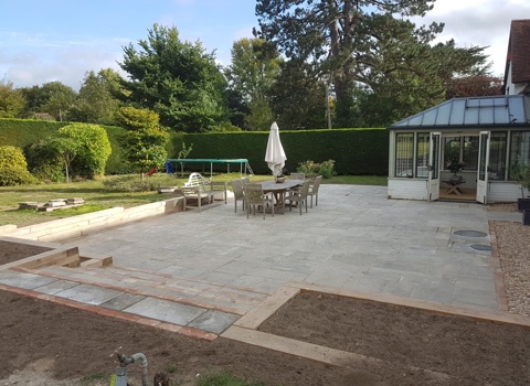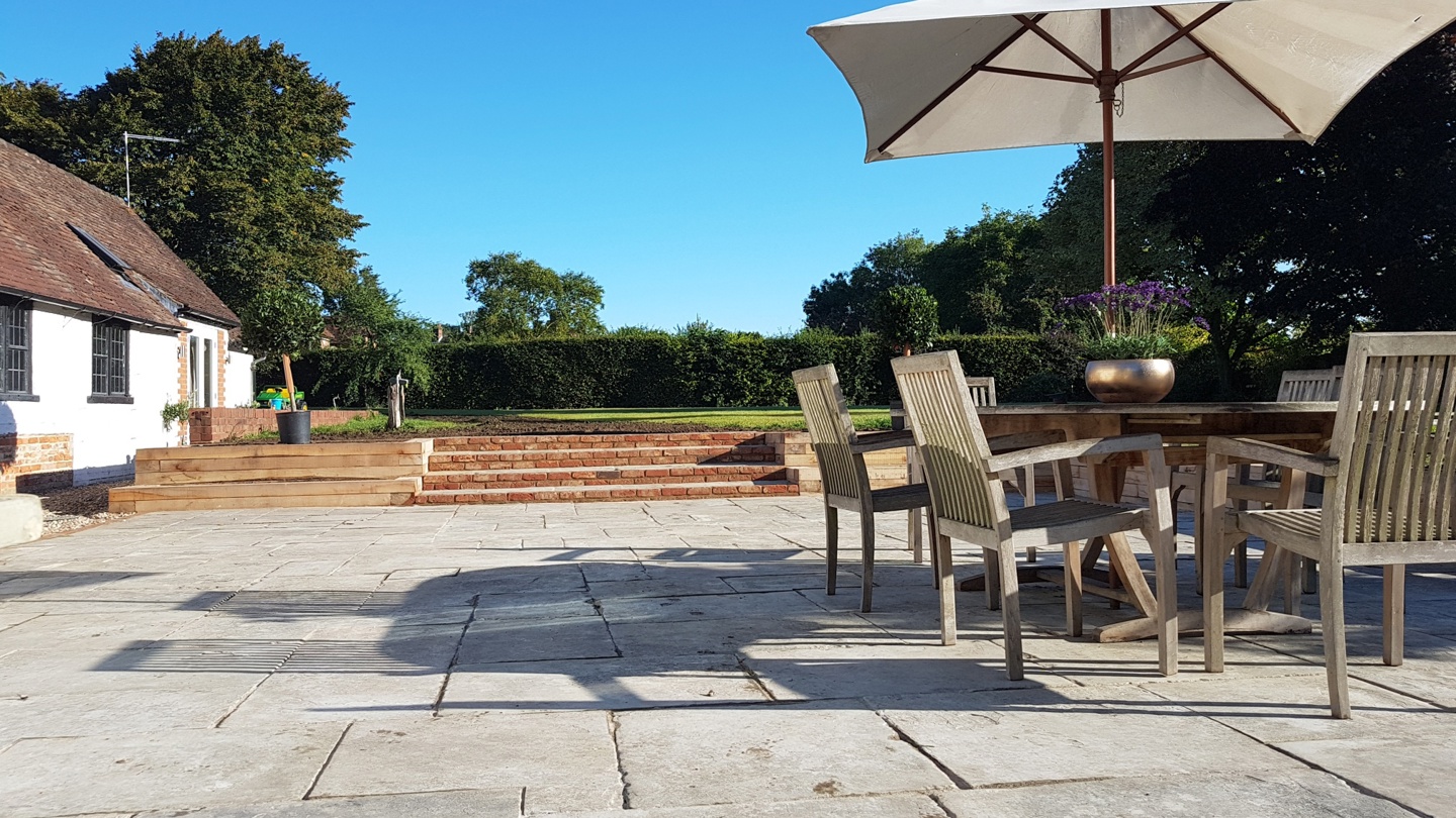 Digging out, levelling, sorting the drainage and laying this large reclaimed York stone terrace, shown at its best here in the sunshine, has undoubtedly enhanced the outside appeal of this listed Hampshire home. With a few additional landscaping touches, the terrace is contained within oak sleeper walls, with matching raised beds - filled and ready for planting.