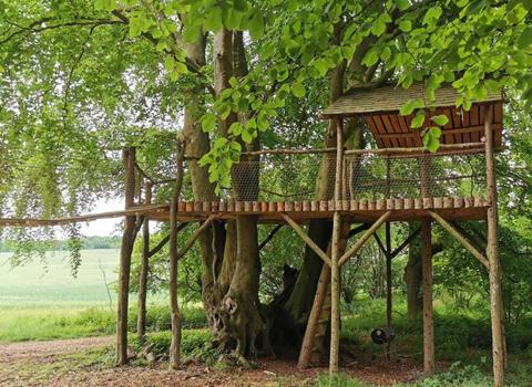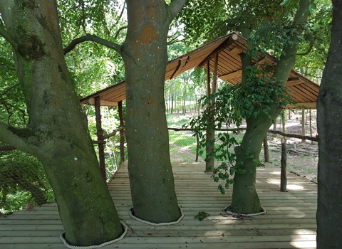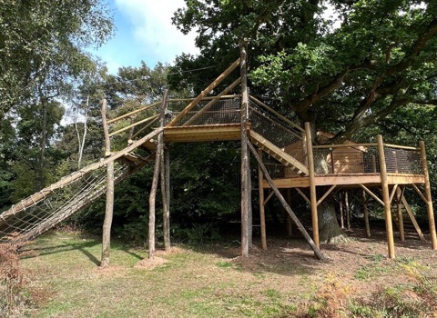 This woodland treehouse complex features a 4m tall zip wire launch platform (for both child and adult enjoyment!) on one level and is accessed via the cargo nets or a ladder. On a lower level is a fully insulated cabin and large platform built around the tree trunk. The all weather cabin has its own covered balcony and is a perfect spot for an overnight adventure or a peaceful retreat amongst the trees.