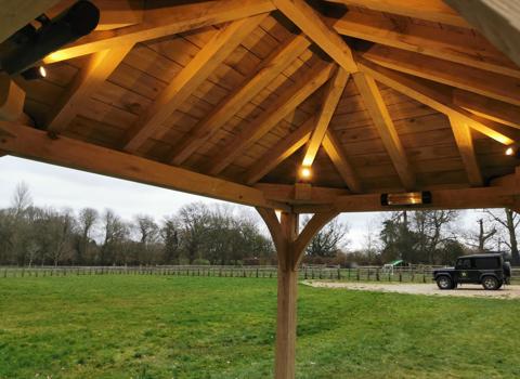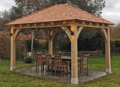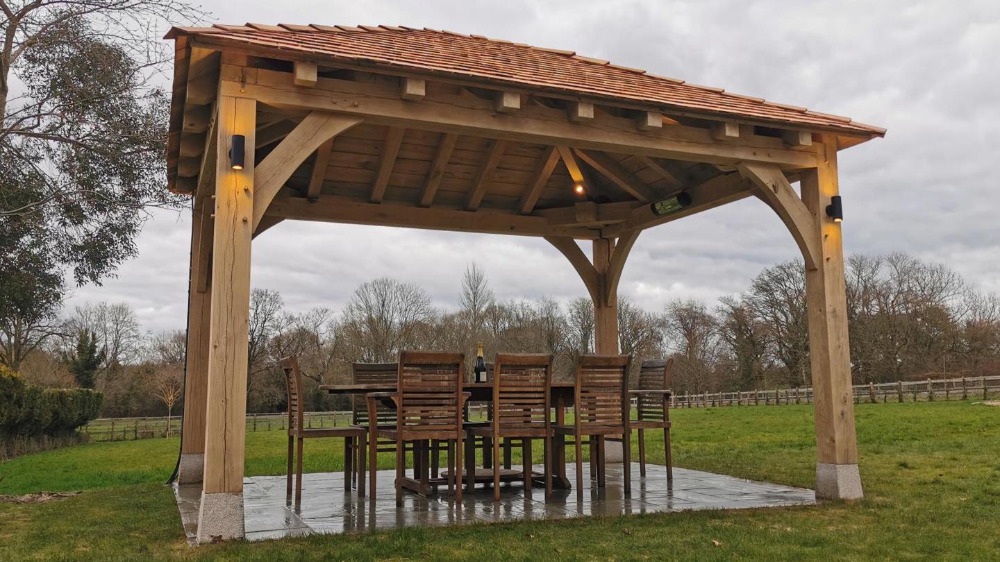 This garden gazebo features a low pitched cedar shingle roof and an oak frame sitting on granite staddle stones. Oak sarking boards are fitted underneath the roof to give a super smart finish to the inside and match the oak frame. We have also installed electrics with a range of lighting inside and out, and heaters, so our clients get maximum use out of their new structure long into the evenings.