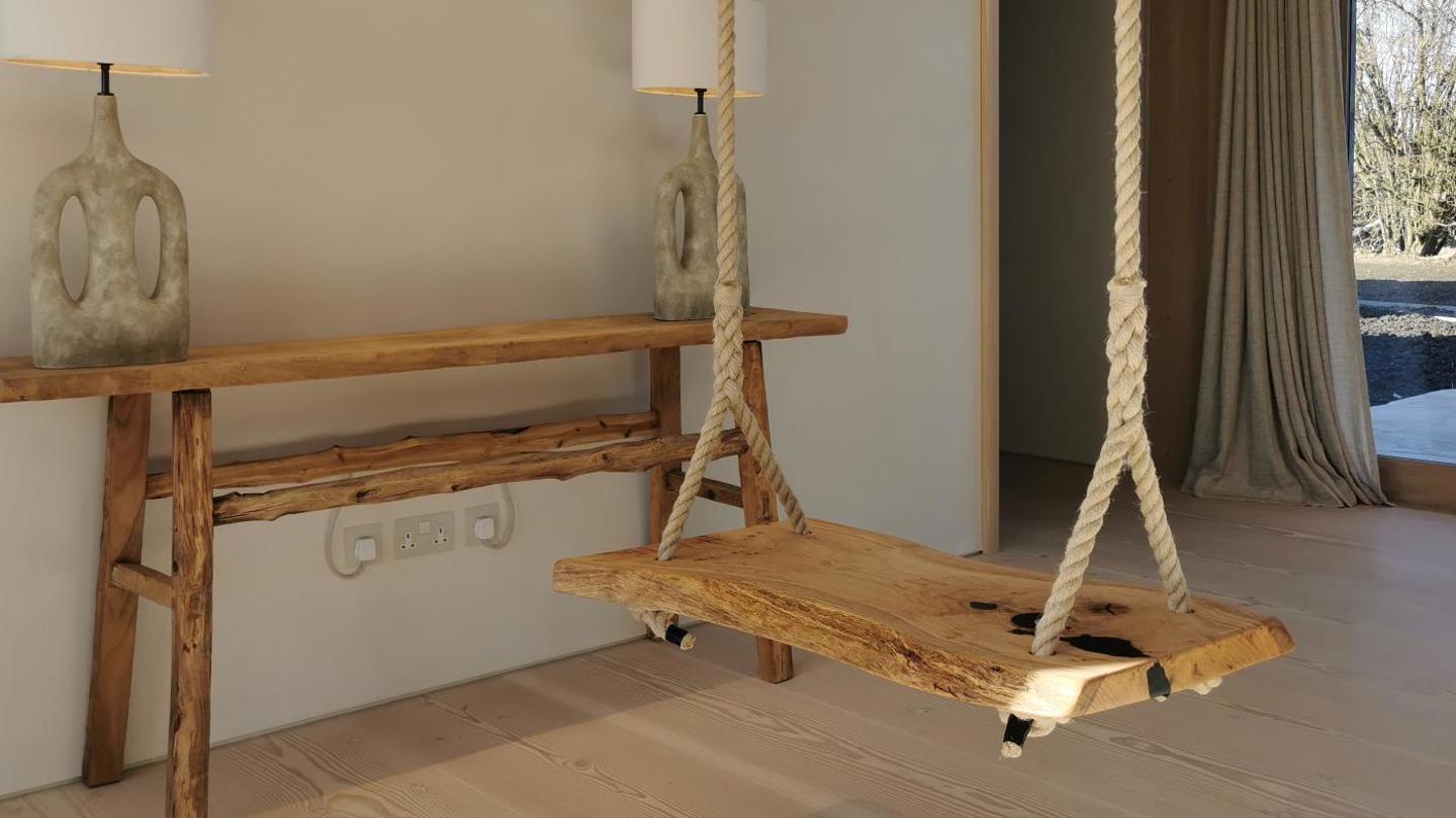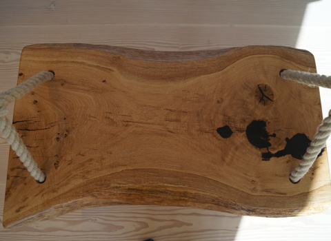 Who doesn't want an inside swing? This one hangs with a view from either side and has been made using a knarly old piece of oak that is uneven and full of knots. Holes have been filled with black epoxy resin and the rough edges sanded just enough to give the seat a smooth finish.