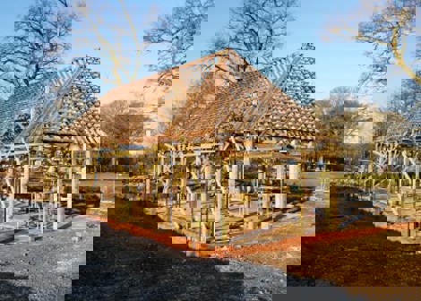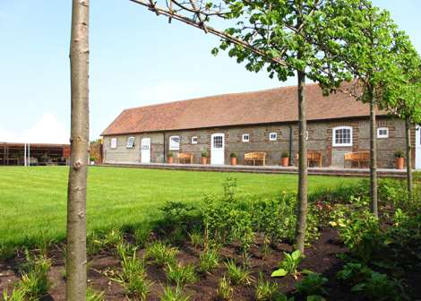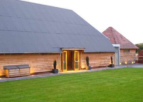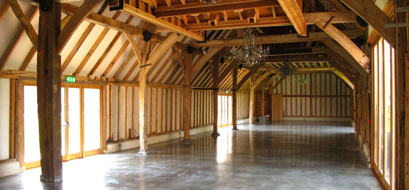 This is the Threshing Barn at www.southendbarns.co.uk, a major restoration project of a beautiful old building. Aiming to keep as much of the original timber frame as possible, it features a complex web of oak posts and beams where new meets old. Reflected in the highly polished concrete floor, the vaulted ceilings and restored oak frame creates a stunning location for a wedding breakfast.