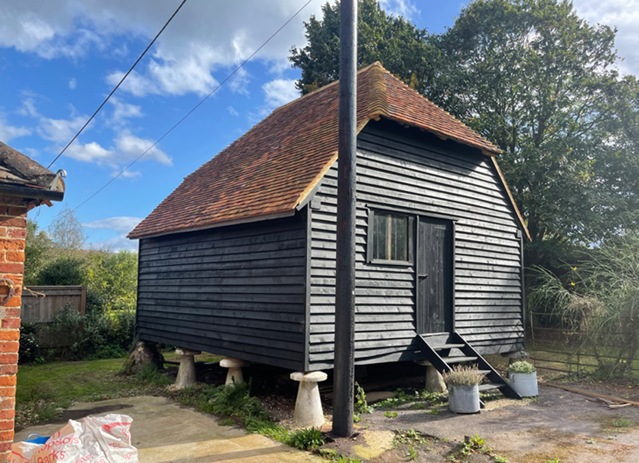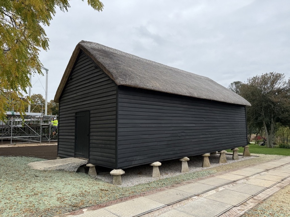 This listed granary required covered scaffolding before stripping back to the bare bones, underpinning, replacing and/or repositioning of the staddle stones and a full re-clad painted in black barn paint before what would have been an original thatched roof was reinstated.