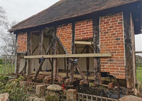 Another listed granary that was in much need of restoration! We have to strip the building back to its basic frame to fully appreciate what work is needed and assess what can be kept and what timbers need to be strengthened by splicing with new hand crafted oak. Once the integrity of the building is restored, we re-dress it with oak cladding, reclaimed roof tiles and, in this case, hand crafted oak mullioned windows, steps and doors - both front and back. Lastly, we restore the dwarf brick wall with original bricks and traditional lime mortar to finish.