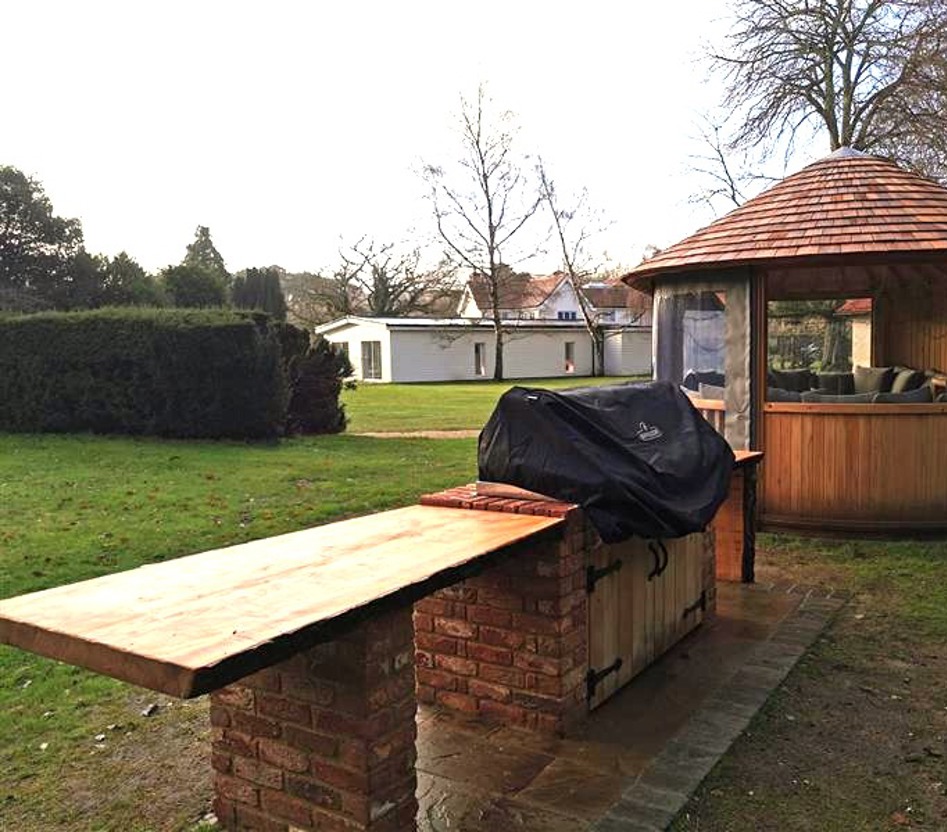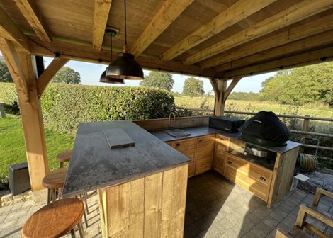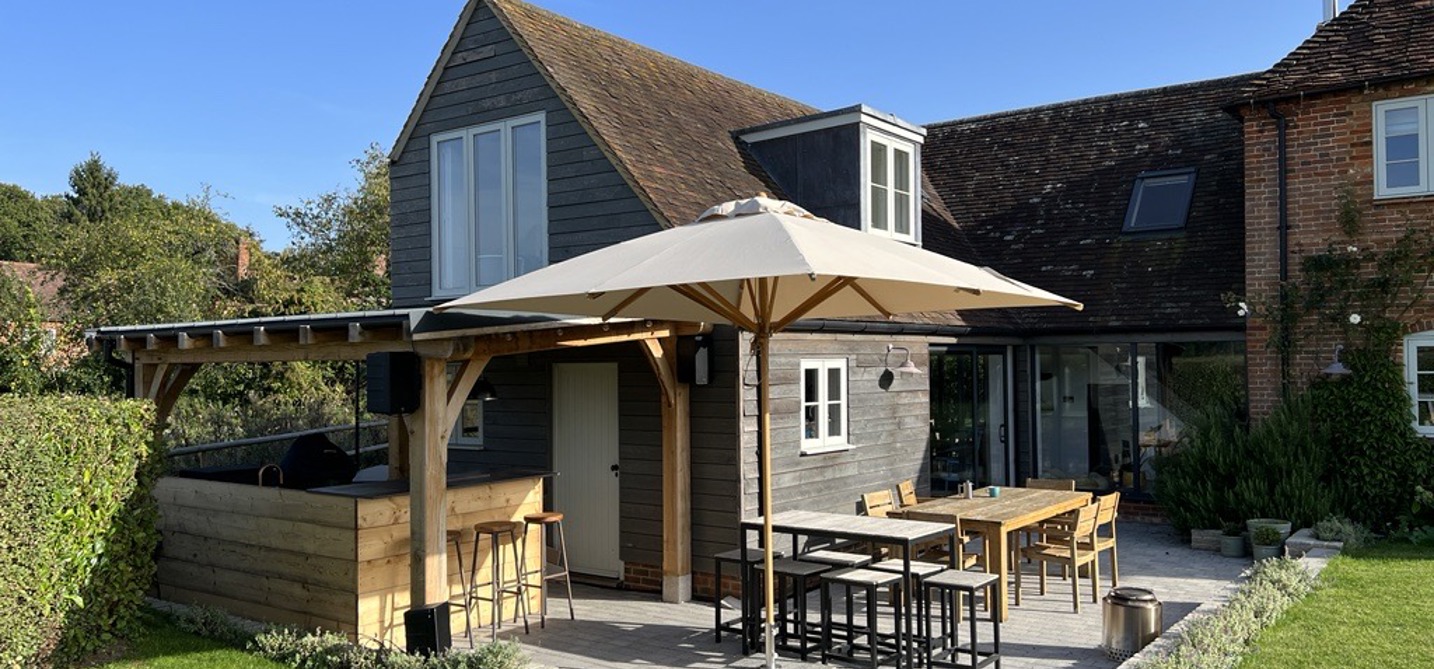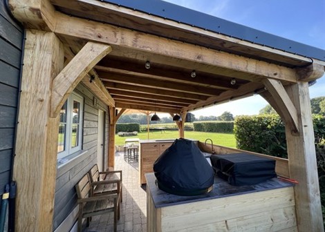 This bespoke oak frame has a standing seam metal roof and has been designed and built to house an outdoor kitchen and bar. Our clients couldn't wait to christen it and had a party before all the units, BBQ, sink and fridge were installed, but at least were able to benefit from the installed lighting and rain protection the frame alone provided.