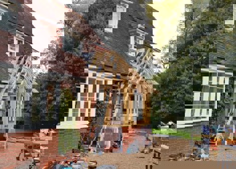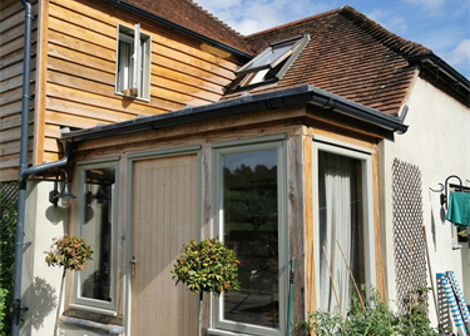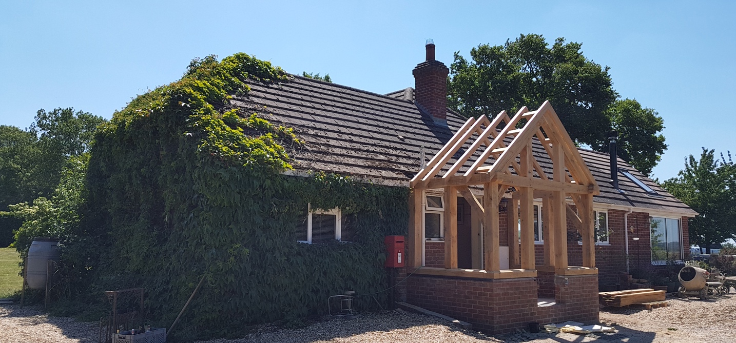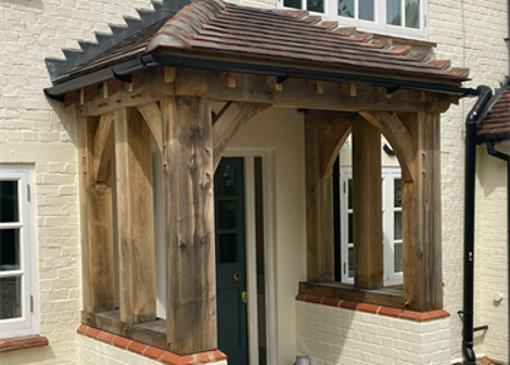 Replacing an existing but dated porch gave this house a much needed and appropriate facelift. Careful handling of the roof tiles during construction meant we could re-use them so the new roof fits in seamlessly. Shown some time after completion, we see the oak now weathered down to a gorgeous silvery grey.