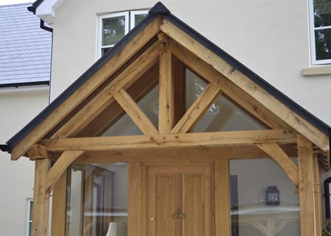 Chunky oak posts provide the support for this half & half flat roofed porch extension. The design creates a covered approach to this single storey home with the second half of the extension built as an internal hall/foyer.