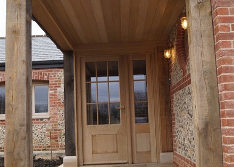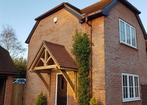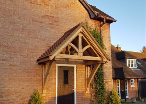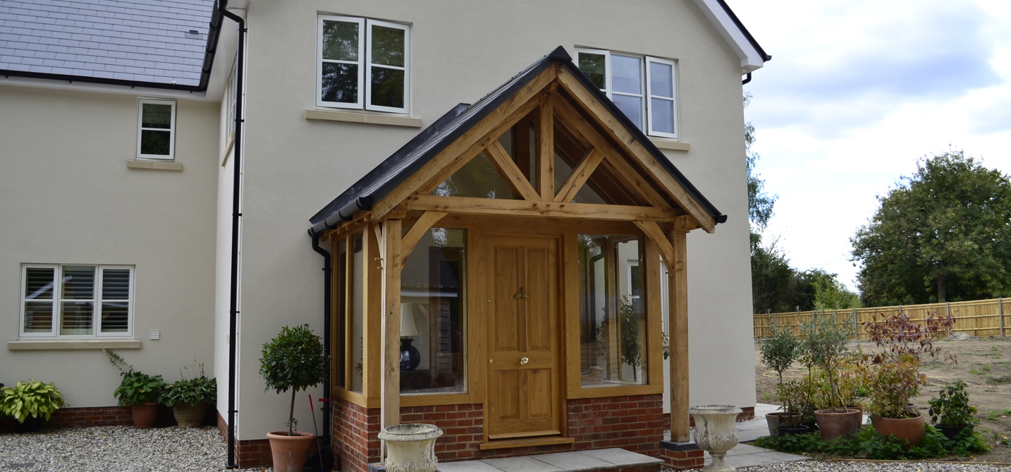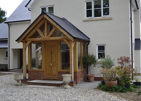 Adding a beautiful oak framed porch to this new build house adds character and practicality. Built on a brick plinth, with glazed panels into the apex and a solid oak front door, the porch itself is recessed under the tiled roof behind two oak posts standing proud, finished with a wide flagstone step.