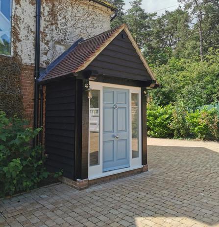 Fully insulated porch extension with black stained cladding, a new side window and full height glazed panels either side of the front door to let in plenty of light.