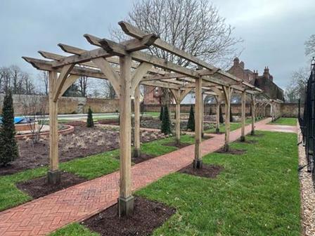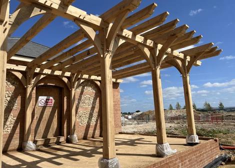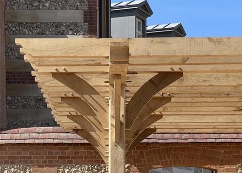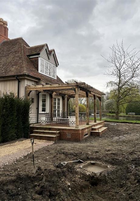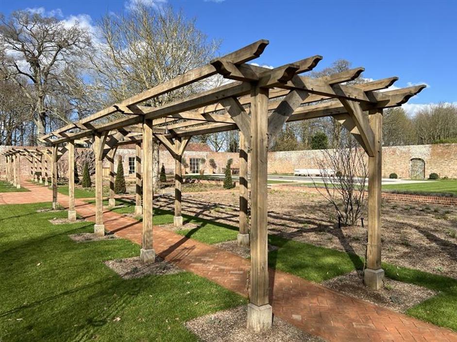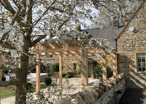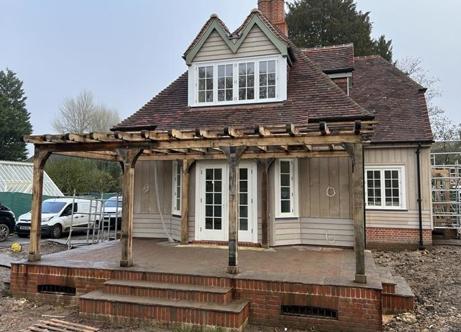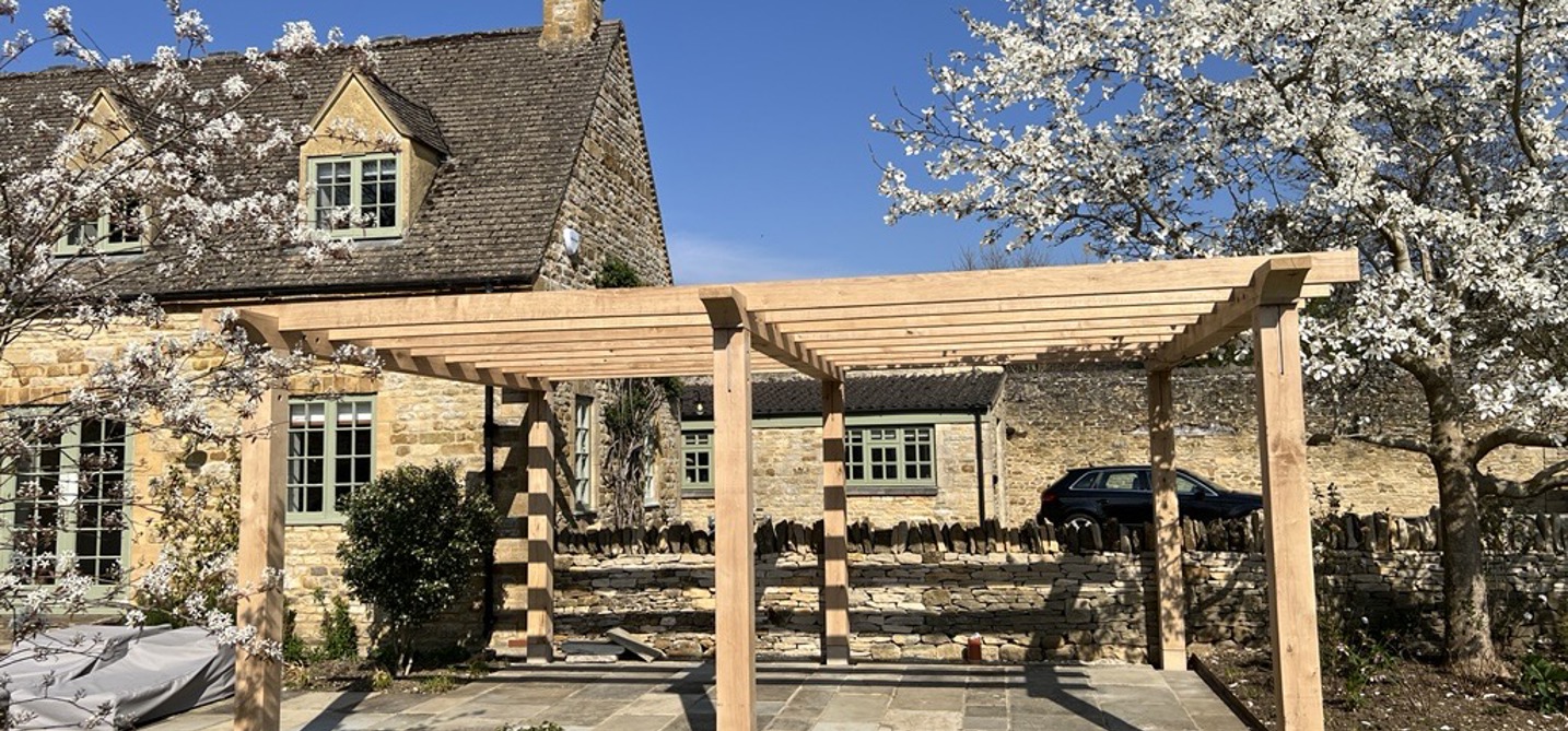 Sitting on a bespoke raised terrace, this pergola was designed to create an outside dining area. It features hand cut decorative ends on the joists and eaves beams, curved braces and posts set on stone staddles.