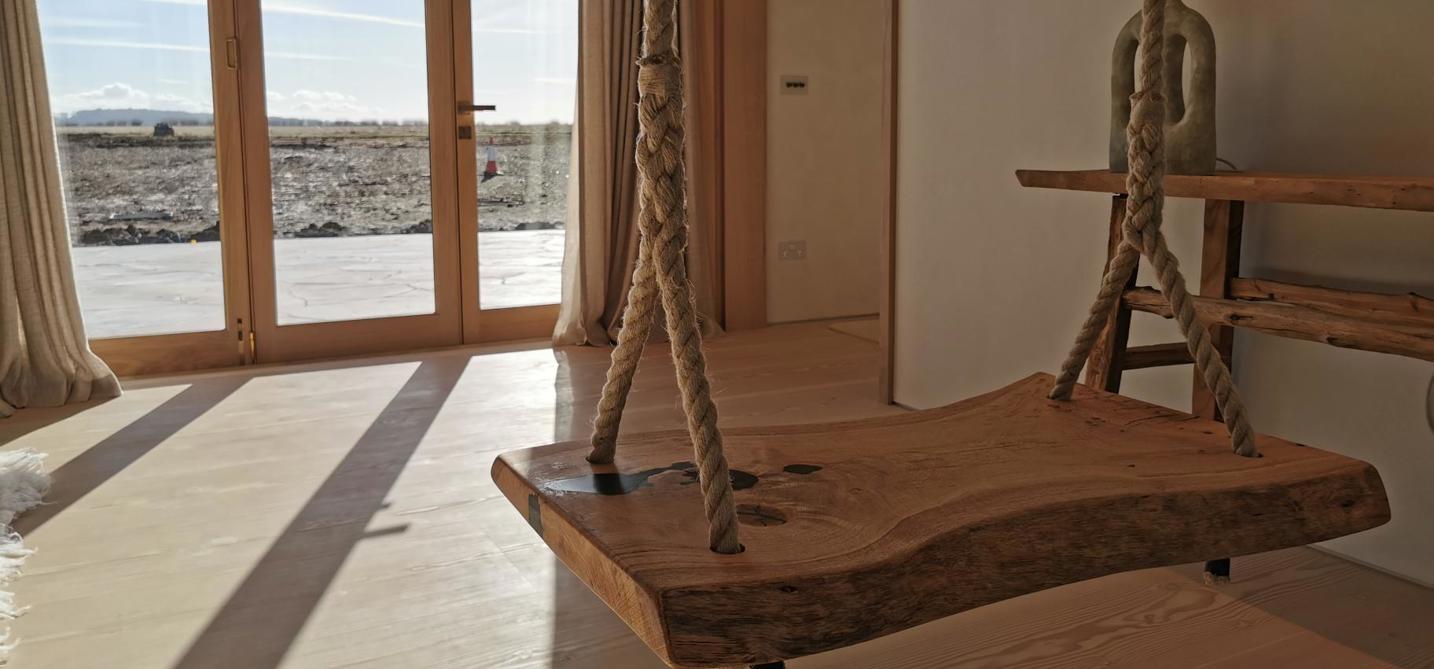 Who doesn't want an inside swing? This one hangs with a view from either side and has been made using a knarly old piece of oak that is uneven and full of knots. Holes have been filled with black epoxy resin and the rough edges sanded just enough to give the seat a smooth finish.