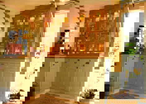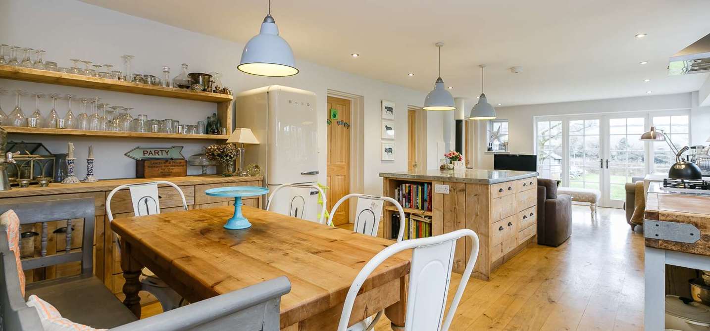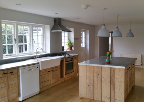 Our clients are delighted with this quality custom built country kitchen, with lacquered weathered oak work surfaces, fitting perfectly in their oak framed extension. With thanks to our friends at www.riverwoodwork.com.
