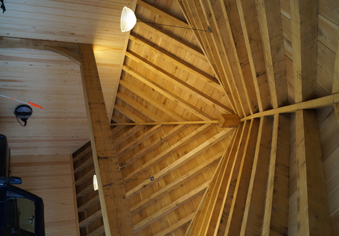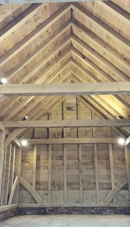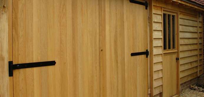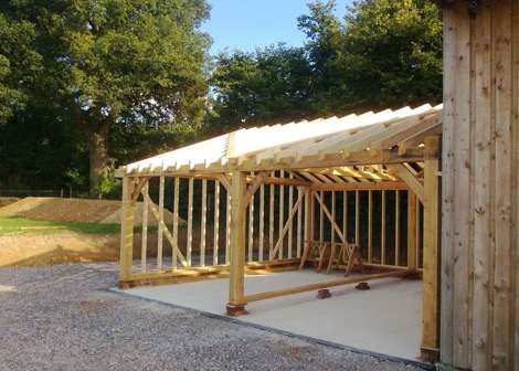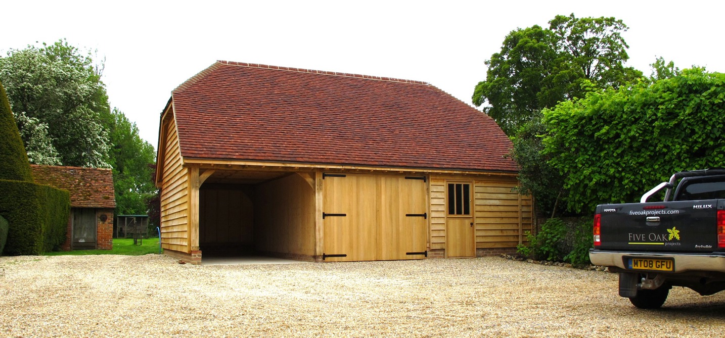 A simple 2-bay oak framed garage extension, clad in oak and with a corrugated roof, designed to match the barn it adjoins.