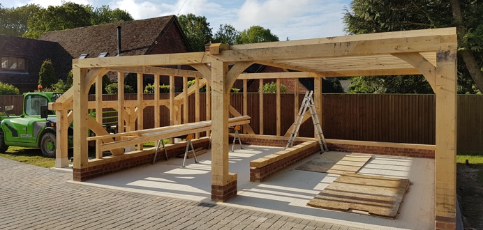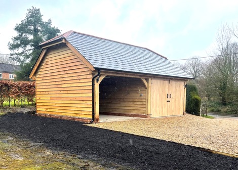 A two bay oak framed garage with one open and one enclosed bay designed as an office space, with a handy log store to the side.