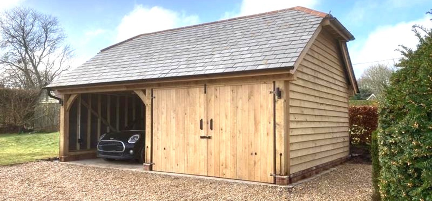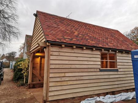 This single garage is oak through and through; oak frame, oak cladding, oak sarking boards, oak studs and rafters. The finished building sits on a low brick wall with a concrete floor, a clay tiled roof, small side window, interior and exterior lighting and power outlets inside.